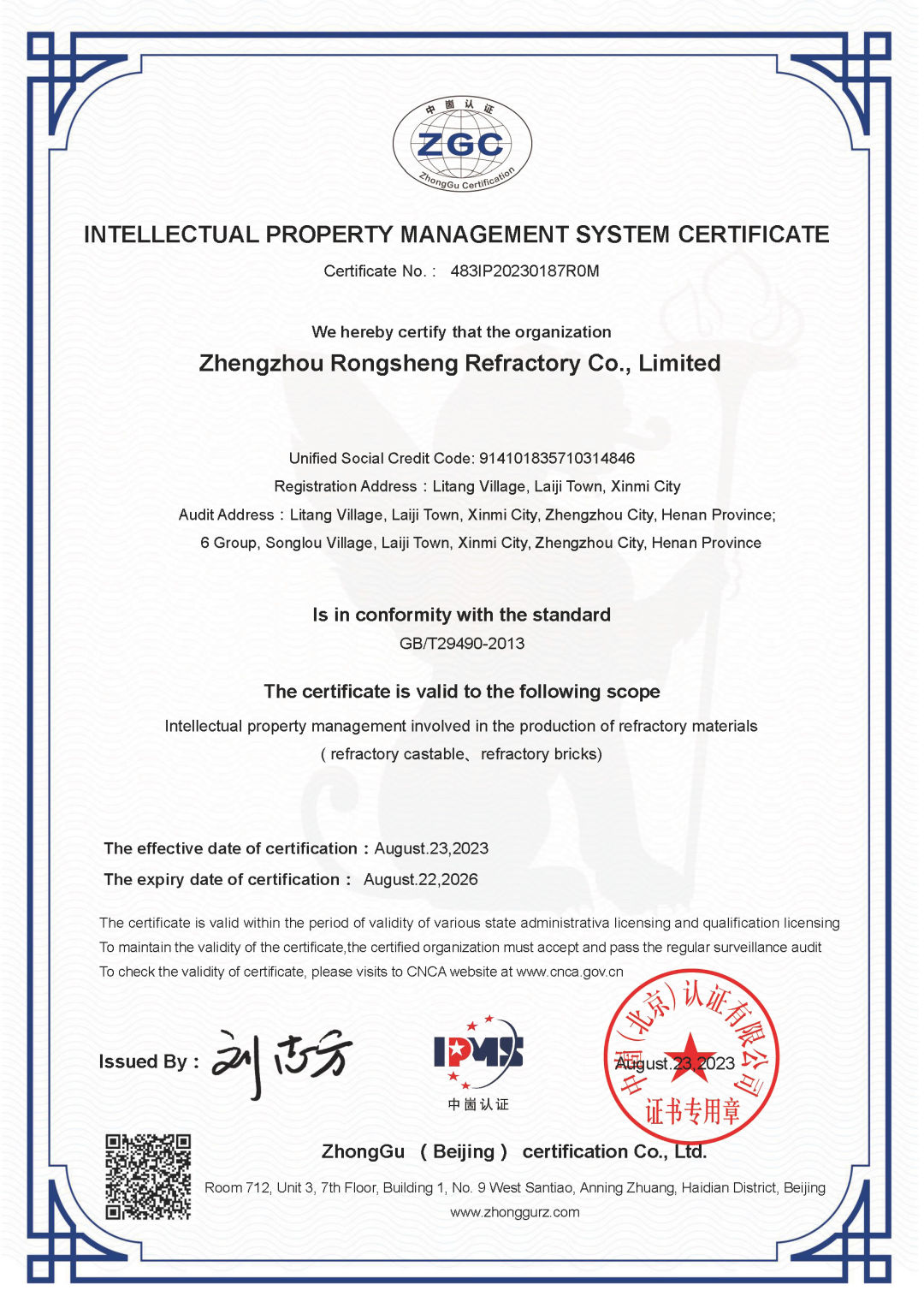 【概要描述】 近日,鄭州榮盛窯爐耐火材料有限公司(以下簡(jiǎn)稱(chēng)「榮盛耐材」)順利通過(guò)國家知識產(chǎn)權貫標認證,并獲得了《知識產(chǎn)權管理體系認證證書(shū)》中英文雙語(yǔ)認證。該項認證的順利通過(guò),標志著(zhù)榮盛