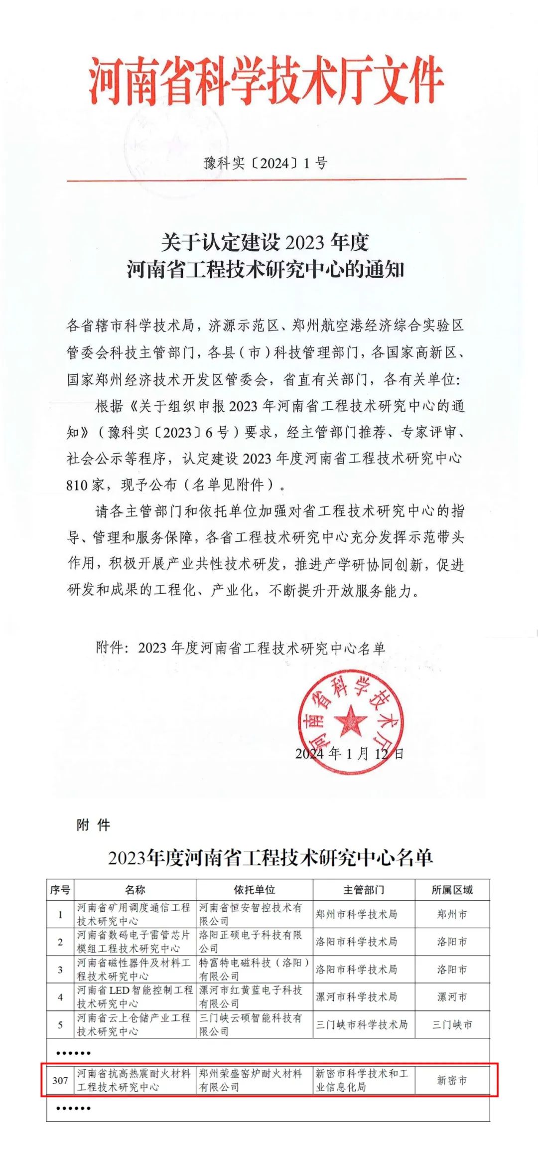 喜訊!榮盛耐材成功獲批「河南省工程技術(shù)研究中心」