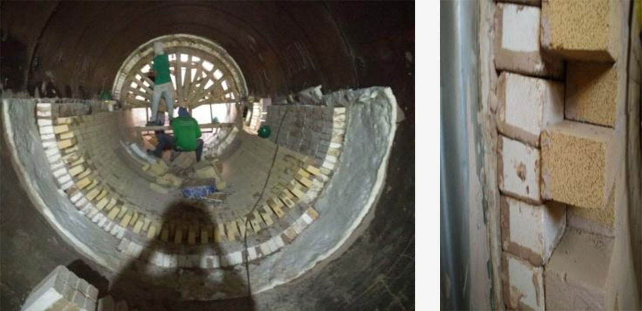 將體積密度0.6 g/cm3的普通粘土質(zhì)輕質(zhì)保溫磚和體積密度0.5 g/cm3的超微孔保溫磚同時(shí)在1050℃下保溫3小時(shí)燒后,普通粘土質(zhì)輕質(zhì)保溫磚由230mm收縮到190mm,磚體嚴重變形,而超微孔保溫磚尺寸未發(fā)生變化,外觀(guān)完好。